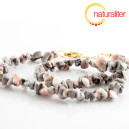 Návlek zlomků z růžového achátu (směs minerálů), zlomky jsou velké, cca 5-10 mm. Cena za návlek dlouhý asi 40 cm, návlek je prodáván s pozlacenými komponenty jako náhrdelník.