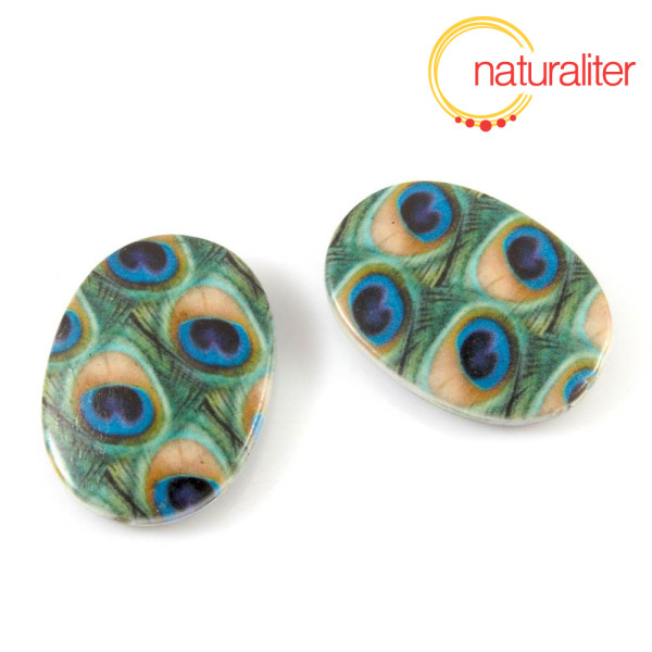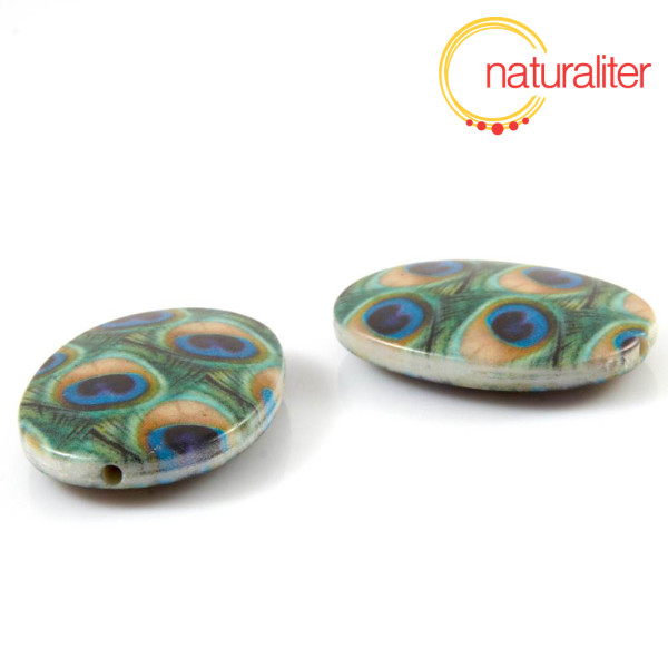 Velký plochý oválný korálek s motivem pavích per je vhodný jako ústřední motiv šperku.
