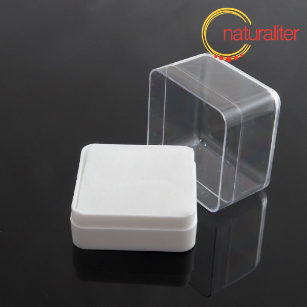 Průhledná plastová krabička na šperky s bílou nebo čirou průhlednou spodní částí a vysokým víčkem.