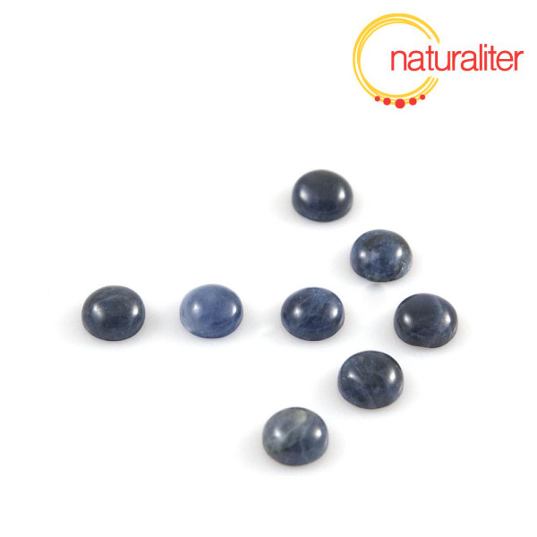 Kabošon z modrého nebo modrobílého sodalitu, kruhový o průměru 6 mm. Cena za 1 ks.