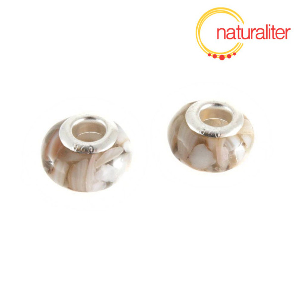 Korálek z kousků bílé a béžové perleti spojené pryskyřicí hnědé barvy. S mosazným dvoudílným jádrem ve stříbrné barvě.