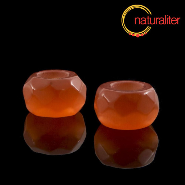 Skleněný fazetovaný korálek s efektem kočičího oka s velkým průvlekem. Oranžová barva.