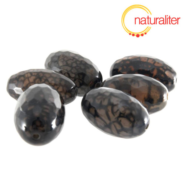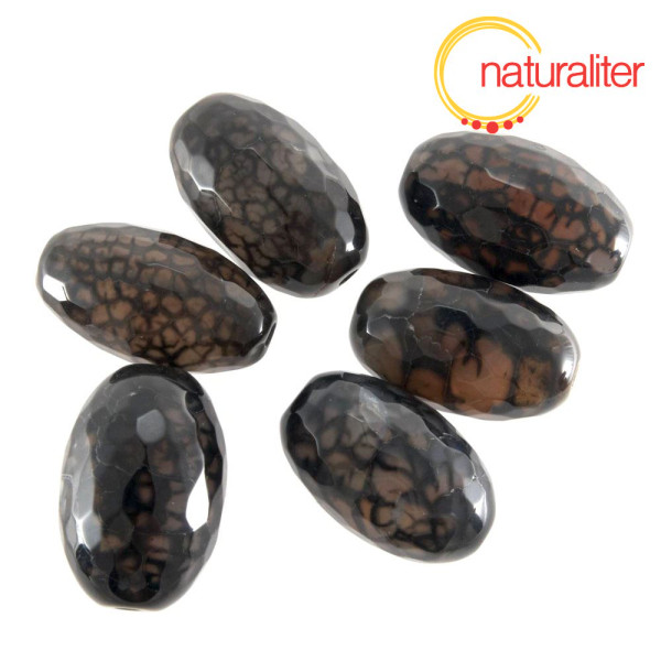Broušený fazetovaný korálek z achátu, který je zahřívání krakelovaný (popraskaný) a následně obarvený, takže získává zajímavý efekt dračího vejce (dračích žil). Jde o přírodní achát, následně upravený, takže se jednotlivé korálky liší.
