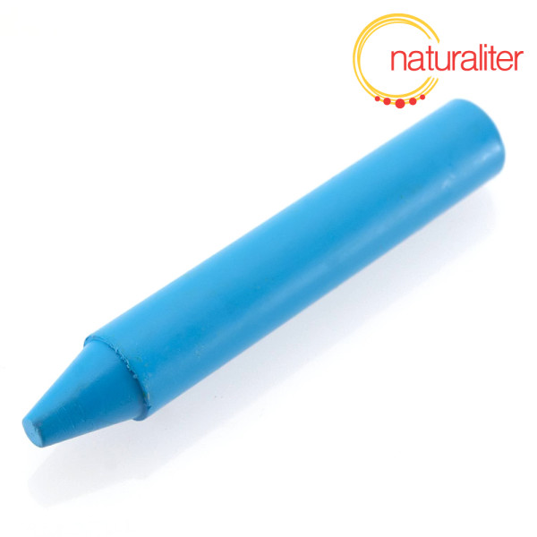Světle modrá kulatá voskovka JOVI. Délka 73 mm, průměr 11,5 mm.