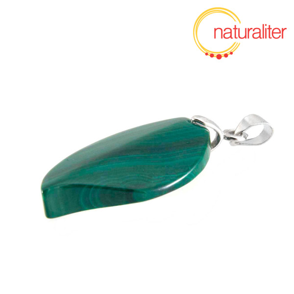 Přívěsek z malachitu ve tvaru lístku s vrtanou dírkou.