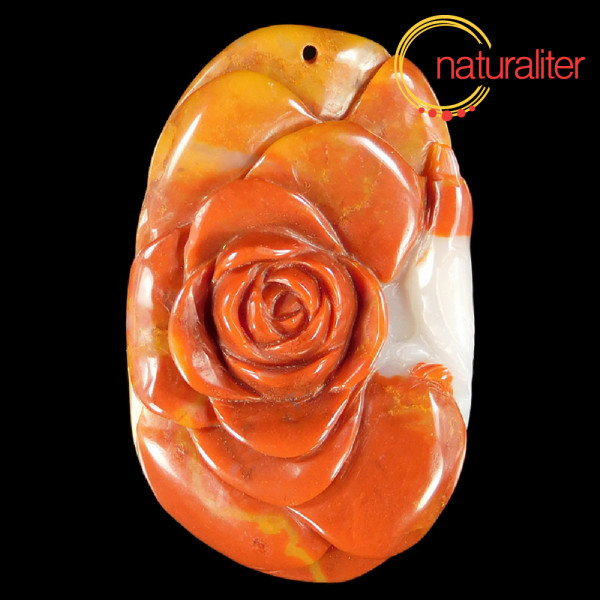 Motiv růže s malým ptáčkem na boku vyřezaný do směsi minerálů (jaspis, aventurín a křemen), kdy se jednotlivé barvy prolínají a vzájemně doplňují.