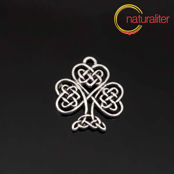 Kovový přívěsek, který vyobrazuje strom se stylem keltských uzlů, s očkem pro zavěšení.