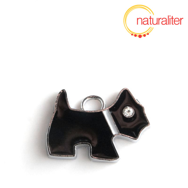 Kovový smaltovaný přívěsek, který zobrzuje černého teriéra s bílým obojkem.