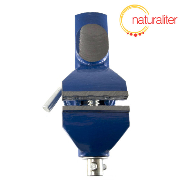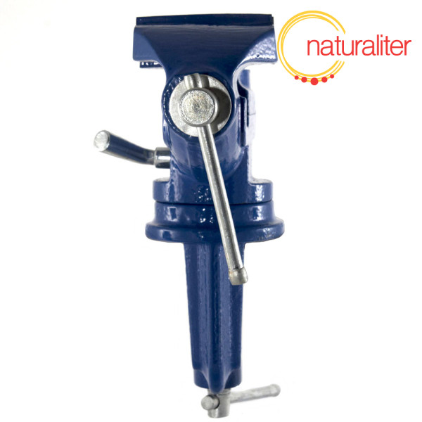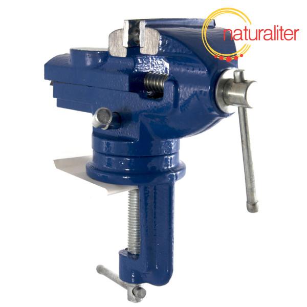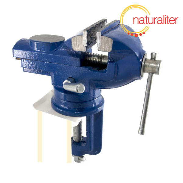 Malý stolní svěrák s kovadlinkou. Díky svěrce lze snadno připevnit k pracovnímu stolu nebo desce. Svěrák má otočný kloub.