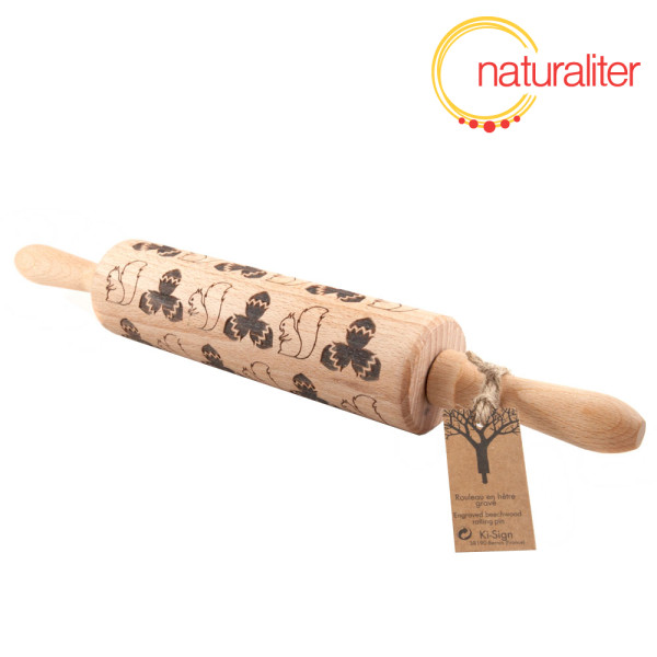 Bukový váleček s texturou se vzorkem veverek s lískovými oříšky.
