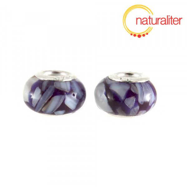 Korálek z kousků bílé a béžové perleti spojené pryskyřicí fialové barvy. S mosazným dvoudílným jádrem ve stříbrné barvě.