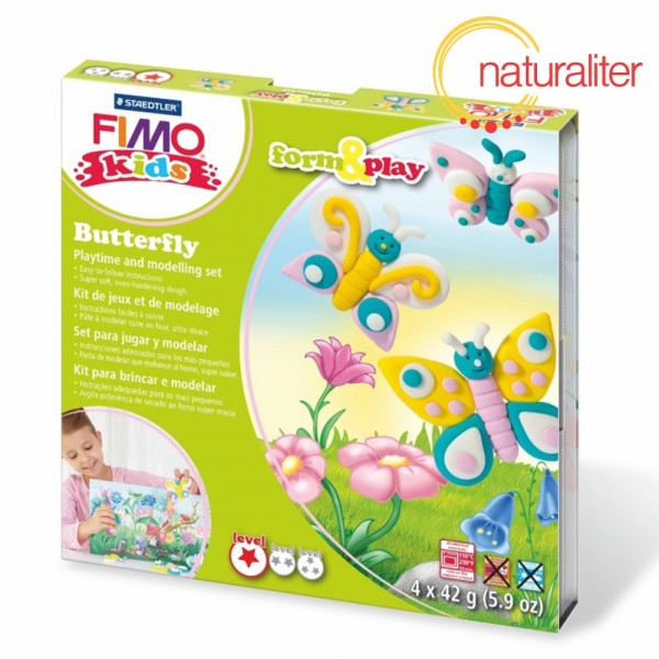 Kreativní sada FIMO Kids pro děti s motivem barevných motýlků. Vhodné pro děti od 8 let nebo od 6 let s dohledem.