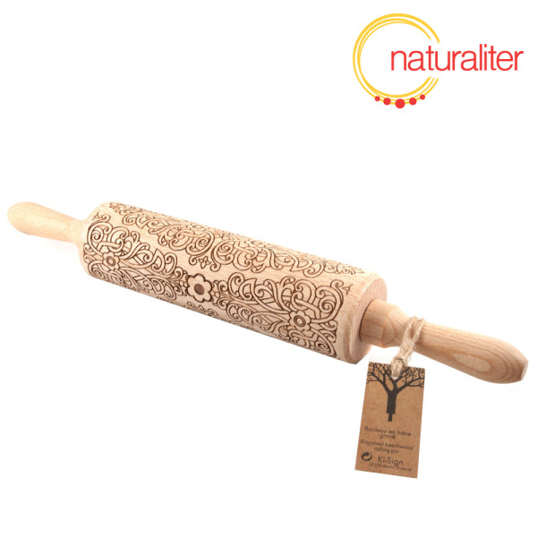 Bukový váleček s texturou s motivem araesky doplněné o několik květů.