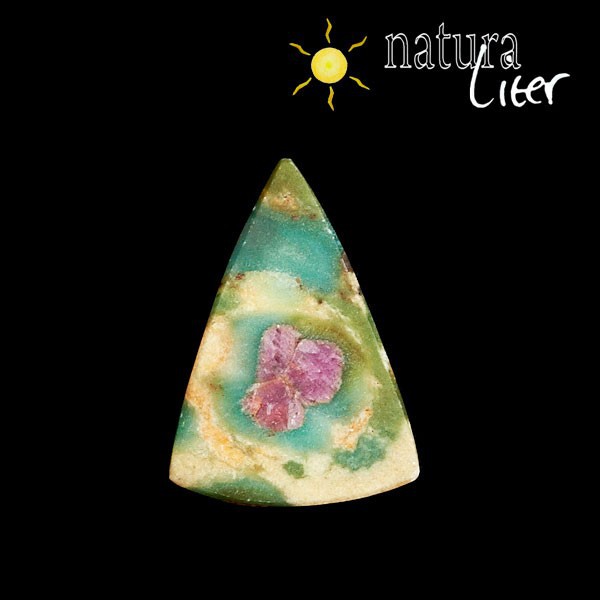 Kabošon rubín ve fuchsitu, leštěný. 26 x 19 x 5 mm, 3 g. Původ: Indie.