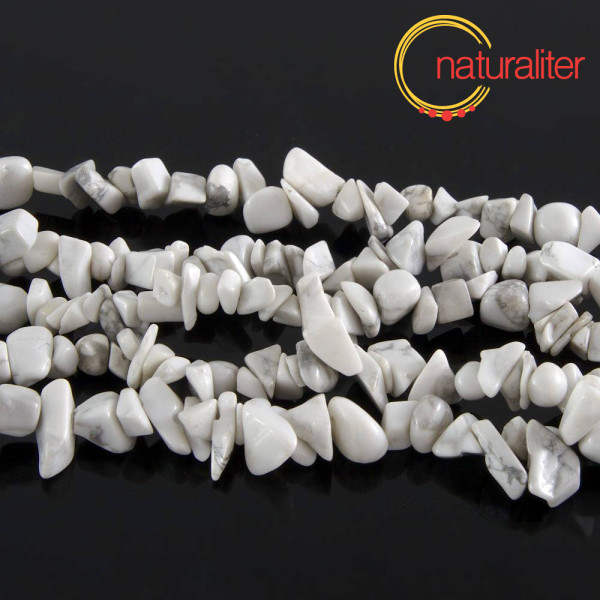 Bílý howlit (nebo magnezit) je paradoxně nejvíc známý v obarvené formě jako tyrkenit (imitace tyrkysu). Jeho přírodní forma je ale zajímavá pro tvorbu kompozic s dalšími korálky nebo i jen sama o sobě.